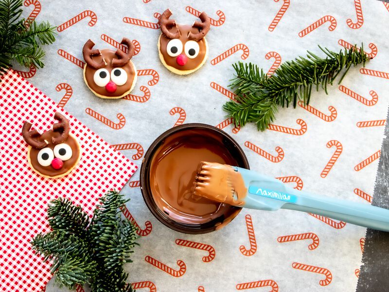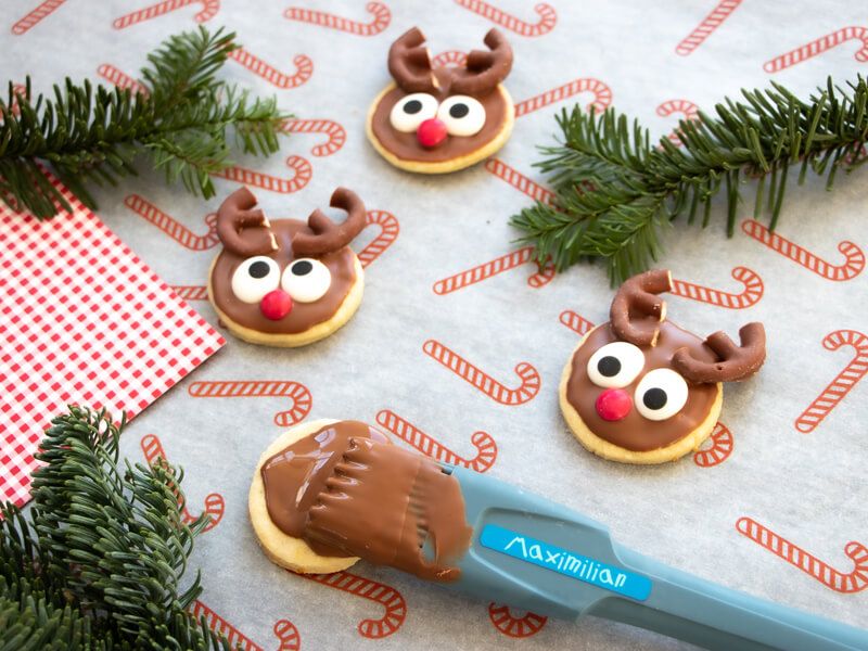 The rest is done quickly: brush the biscuits with whole milk couverture and immediately decorated with sugar eyes, chocolate pretzels and red noses.