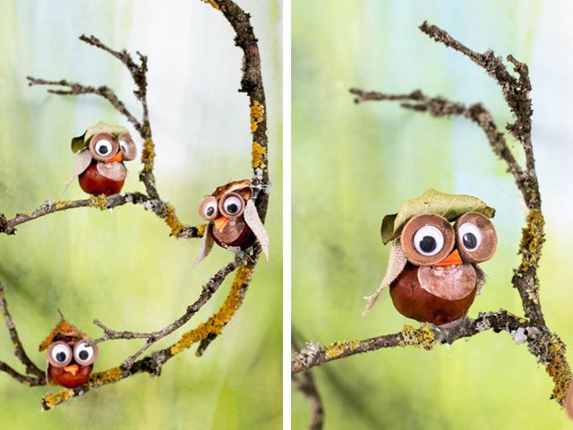 When all the owls are finished, you can glue them to a small branch and hang them in the window. Have fun collecting and doing your little chestnuts owls!