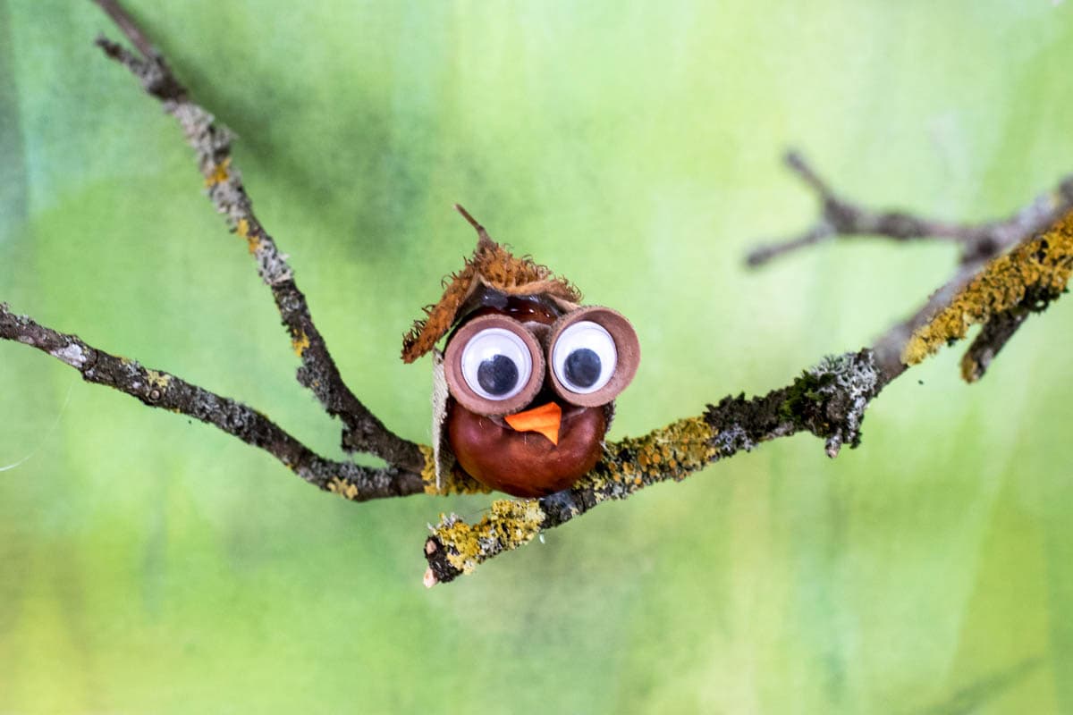 Let’s start! Start with the eyes: use the craft glue and place the wobbly into the acorn caps and then attached them to a chestnut with hot glue. We used old fabric from a cloth to cut out the wings. Alternatively you can simply use craft cardboard. Now let’s get the owl a hat! Use a chestnut shell, a funny leaf or something else. We’re pretty sure your toddlers will come up with something funny.