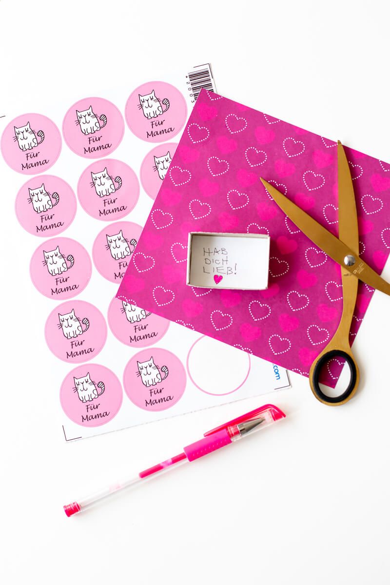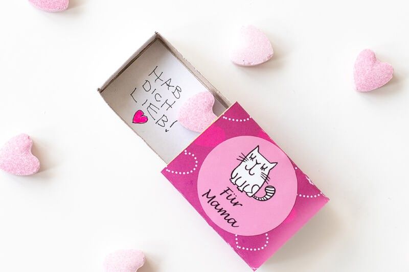 How about a sweet note written by them or a lovely little drawing? Or how about a heart-shaped sweet, a little figure or a small voucher for washing the dishes or emptying the rubbish basket? They can fill the matchbox they have decorated themselves exactly as they wish. The final touch consists of sticking a small customizable label from Stickerkid in the lid of the matchbox. And voila - it’s all done!